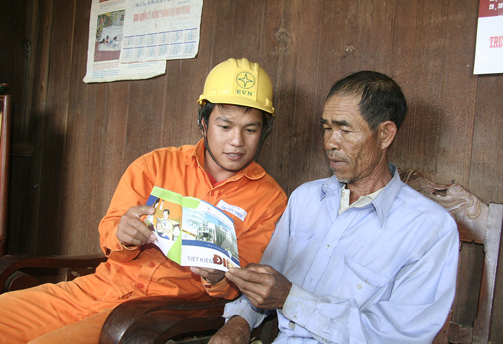 Công nhân Công ty Điện lực Lâm Đồng tuyên truyền tiết kiệm điện tới người dân. Ảnh: Huyền Thương