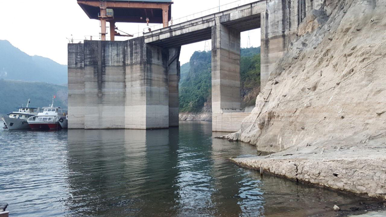 Cửa nhận nước Nhà máy Thủy điện Hòa Bình cạn kiệt (ảnh chụp thời điểm cuối tháng 3/2020) |