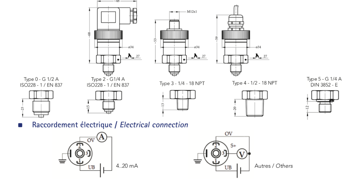 - Kích thước và các kiểu ren kết nối của cảm biến :